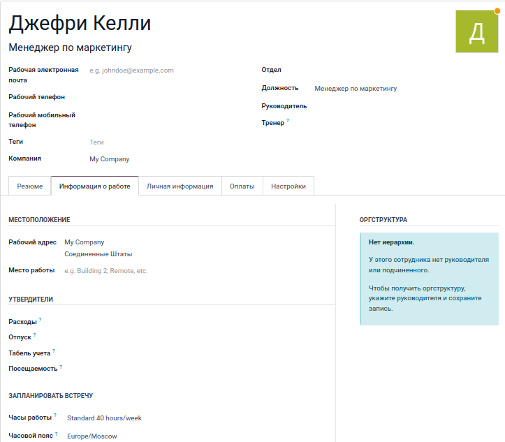 Вы: Да! Я просто создам для него личное дело с информацией из его резюме и назначу вас его руководителем. Я также установлю два рабочих дня из дома: среду и четверг, а остальные дни — в офисе. Итак, он официально стал частью компании, ура!