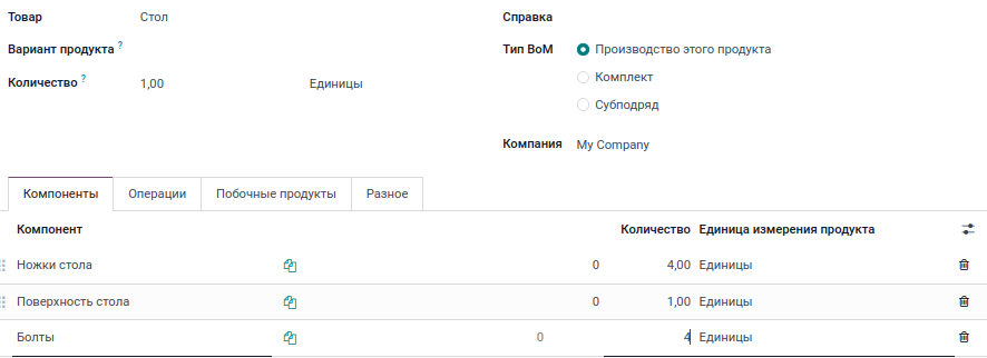 Вы: Выглядит хорошо! Я создам четыре продукта в системе (таблицу и её компоненты) и спецификацию материалов согласно вашему плану.