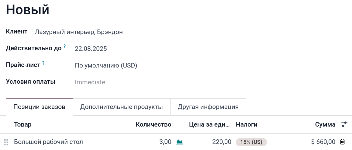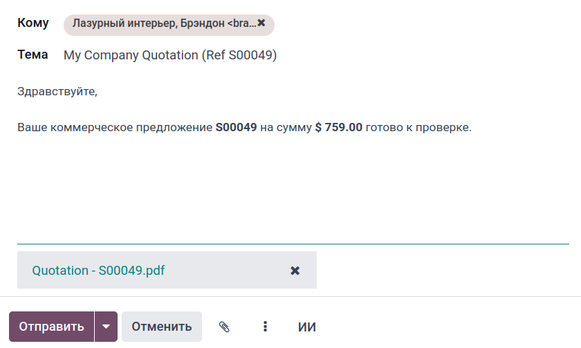 Клиент: Привет! Это Брэндон из «Лазурного интерьера». Я увидел красивые деревянные столы в вашем каталоге. Можешь отправить коммерческое предложение на покупку трех столов на почту brandon@game.odoo.com ?