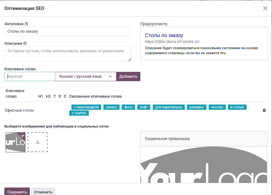 Модуль «Вебсайт» -> Сайт -> Оптимизация SEO